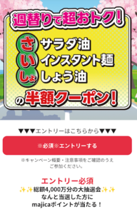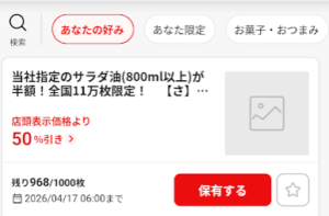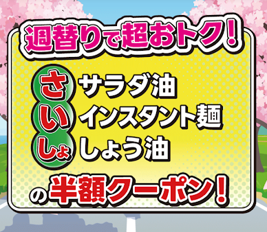 サラダ油、インスタント麺、醤油が半額で買えます!