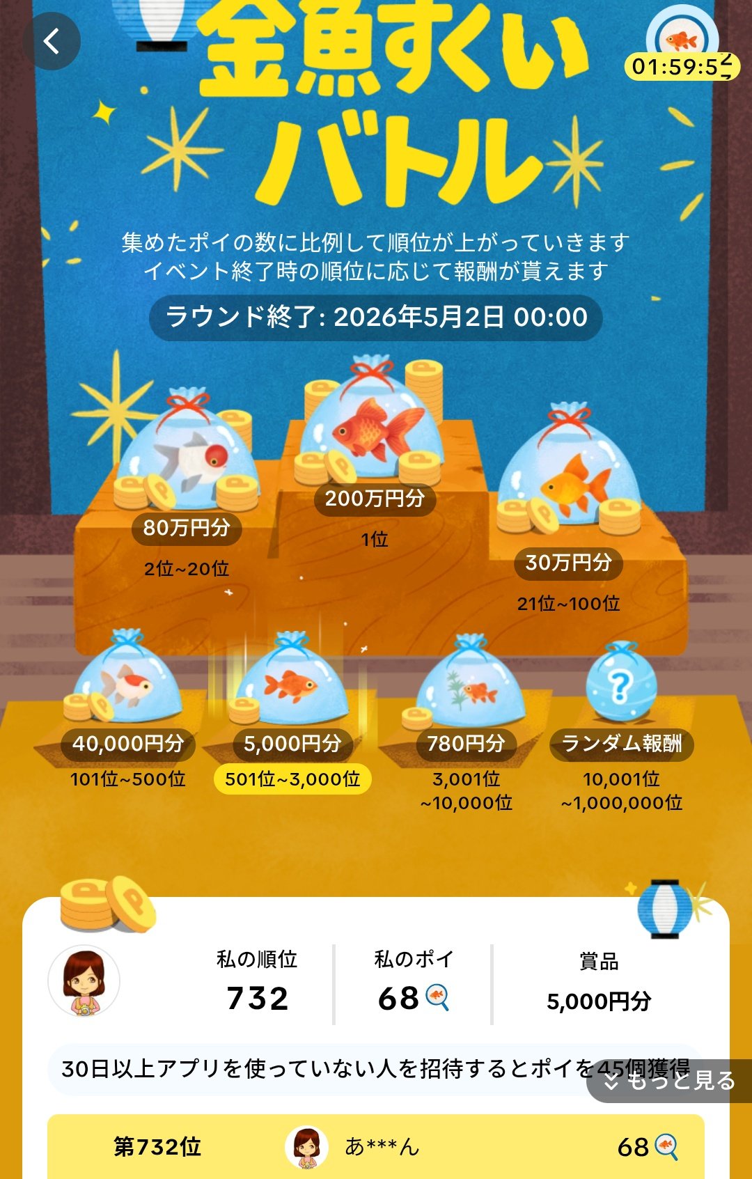 3.金魚をあつめる。集めた数に応じてランキングが上がり、賞品を獲得。