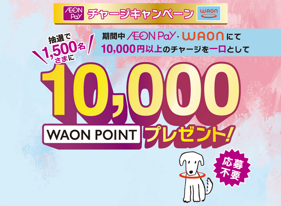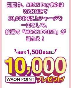 AEON Payまたは電子マネーWAONへのチャージ金額10,000円を1口として、抽選でWAON POINTが1500名に当たります。
