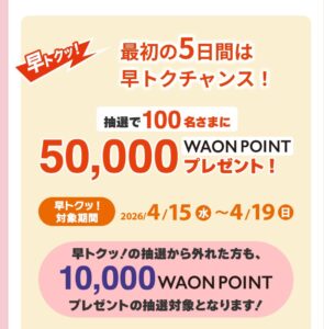 早トクチャンス: 最初の5日間(4月15日〜4月19日)にチャージをすると抽選で100名に5万WAON POINTプレゼントの対象となります。