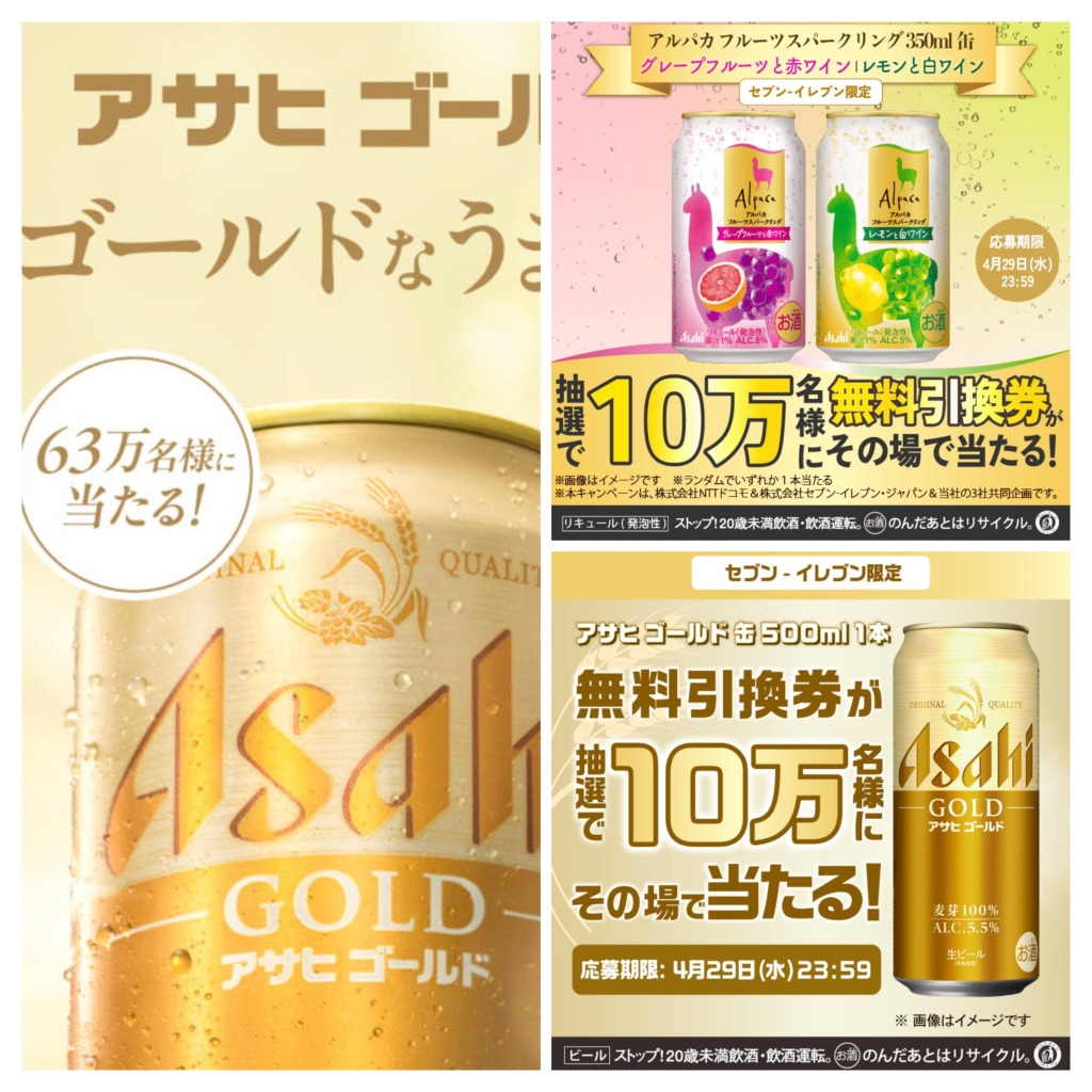 アサヒゴールド 500ml 10万名 〜4/29 dポイント/d払いアプリ セブンイレブン限定