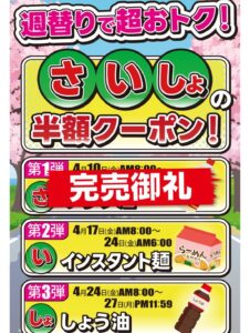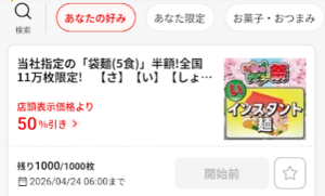 サラダ油、インスタント麺、醤油が半額で買えます!