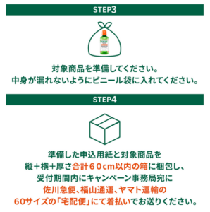 申込用紙に必要事項を記入し、レシート原本または納品書貼って現品を指定の運送業者(佐川急便、福山通運、ヤマト運輸)の60サイズの「宅配便」にて着払いで送付。