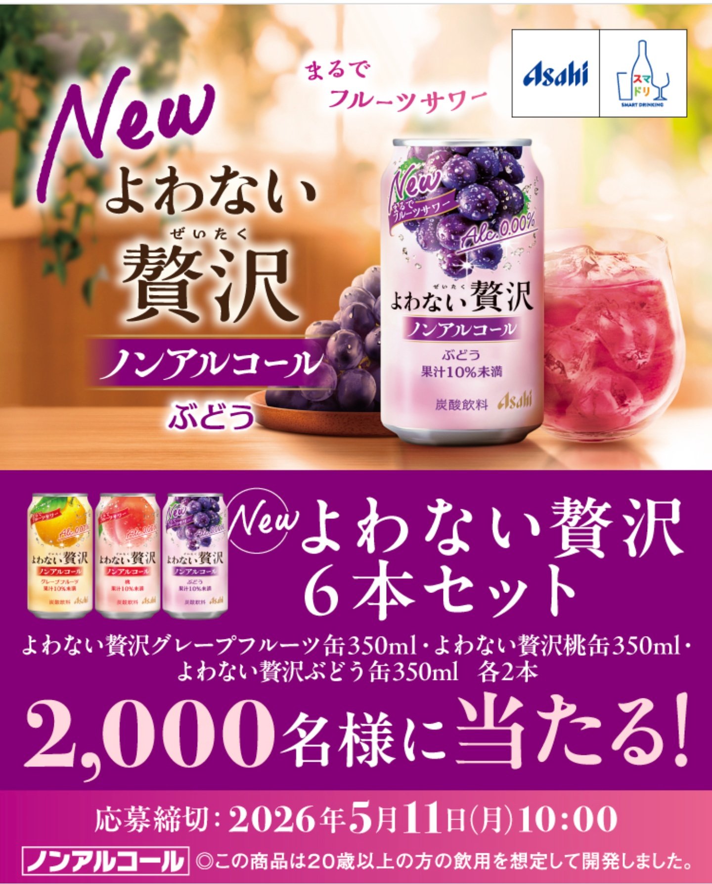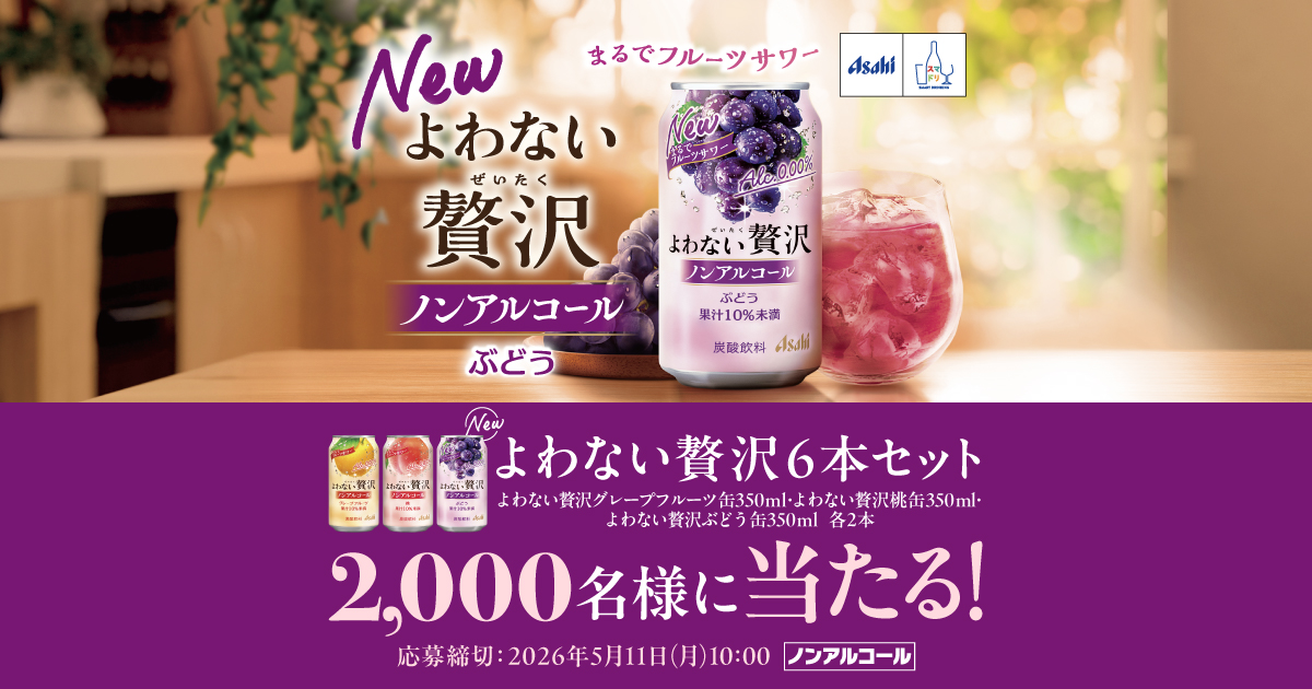 アサヒよわない贅沢 ぶどう(ノンアルコール)6本セットがアンケートに回答で抽選で2000名に当たります。