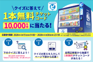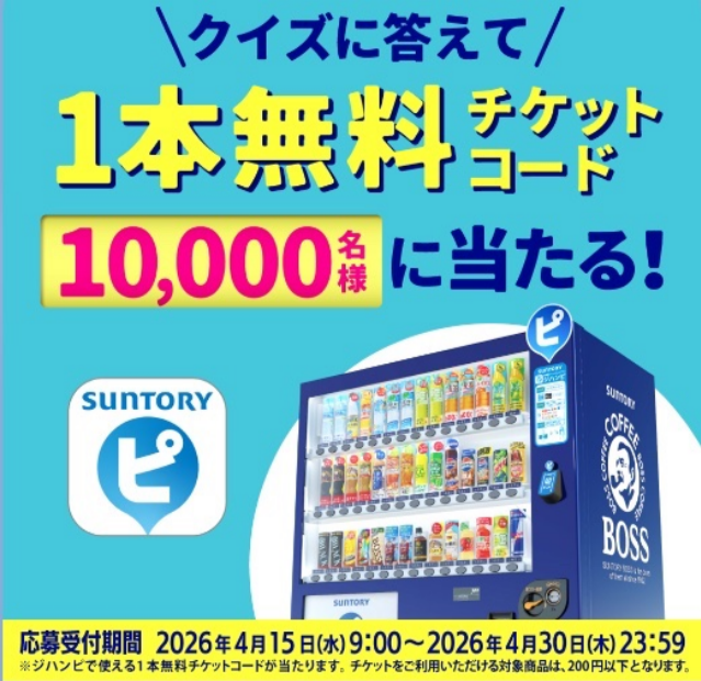 お得なアプリサントリー自販機ジハンピでクイズに答えて全問正解者から抽選で1万名に、