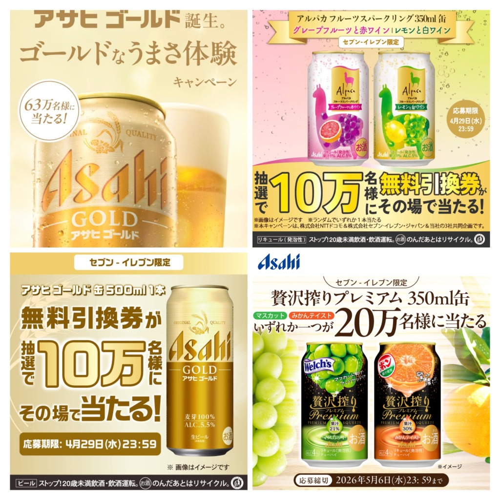 アサヒゴールド 500ml 10万名 〜4/29 dポイント/d払いアプリ セブンイレブン限定