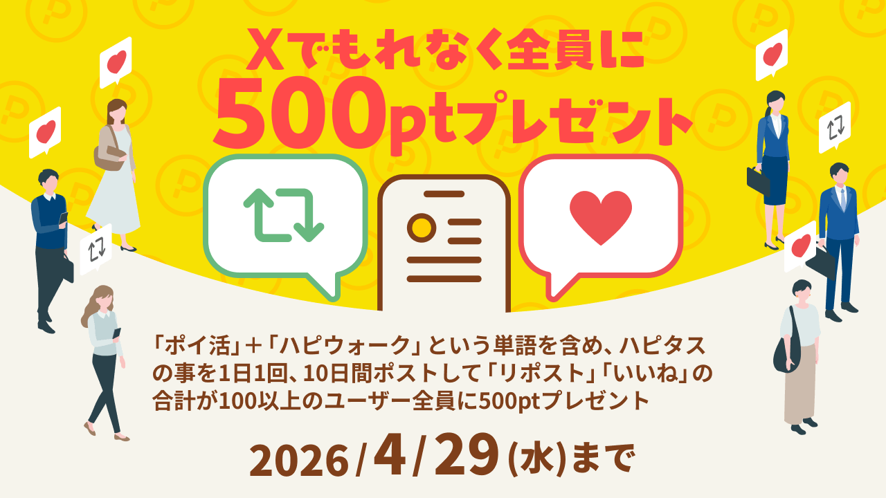 ハピタス「いいね&リポスト」100以上達成でもれなく全員に500円相当もらえる! 「PR」 ポイントサイト X Facebook LINE コピー 2026.04.24 ハピタスで「いいね&リポスト」祭りが始まりました! 「いいね・リポスト100以上」で 全員500円ポイントもらえます。 http://x.com/i/article/2038926889088430080 — ハピタス【公式】 (@HapitasOfficial) April 24, 2026 \今回の条件╱ 1.「ポイ活」&「ハピウォーク」というキーワードを含めて投稿 2.投稿URLをリプ欄にある特設ページから提出 3.投稿の合計いいね&リポスト数が100を超えると50円相当のハピタスポイントを全員にプレゼント! 参加方法 ハピタス公式Xアカウントにて指定した内容に沿って、Xで1日1件ポスト 投稿した当日中(00:00~23:59)に、投稿日に応じたエントリーフォームから投稿したポストのURLを提出してください。 いいね&リポストで紹介コード拡散CP|ハピタスハピタス公式Xキャンペーン。投稿の合計点数100点以上で全員にハピタスポイント500ptをプレゼント! 歩くだけでポイントが貯まるサービス「ハピウォーク」 スマホを持って歩くだけで、いつもの移動がポイントに! ハピタス登録はこちらから
