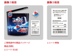 商品を使い切る前に、「商品パッケージ」「商品(洗剤)」「購入レシート」の3点を同時に写るように撮影