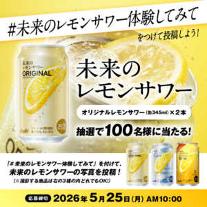 2️⃣ #未来のレモンサワー体験してみて を付けて、未来のレモンサワー(3種どれでもOK)の写真を投稿— アサヒビール ASAHIBEER (@asahibeer_jp) April 30, 2026