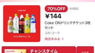 LINEショッピングで日替わりクーポン対象商品が最大70%OFFで購入できる「チャンスタイムクーポン」4月6日 0時~コークオンドリンクチケット3枚 70%OFFクーポン480円⇒144円クーポン獲得条件・「LINEショッピング」の友だち追...