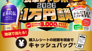 コカ・コーラ社のお茶製品購入レシート1本につきデジタルポイントが30ポイント必ずもらえる「食卓ジャンボ」が1/19~始まります。上限は100本(3000ポイント)まで。抽選で最大1万円全額還元コースもあります。tobibashiさん、開催前...
